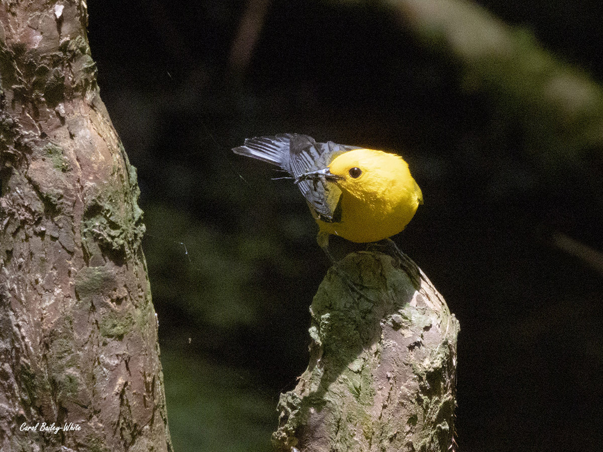 Another summer passes by at our Crosby Sanctuary. As we look toward the upcoming fall migration season, let’s look back at this summer’s breeding season at Crosby. On her June 23 eBird checklist, Jessica Dyszel astutely recorded breeding bird behavior by Ruby-throated Hummingbird, Tufted Titmouse, Carolina Wren and Prothonotary Warbler. The hummingbirds were gathering nest material and building nests! The titmice were observed feeding their young and a recently fledged wren was observed. A total of 8 Prothonotary Warblers were observed that day, four young being fed and four adults! Other species that also potentially nested at Crosby over the summer include Black-crowned Night Heron and Yellow-throated Warbler.
