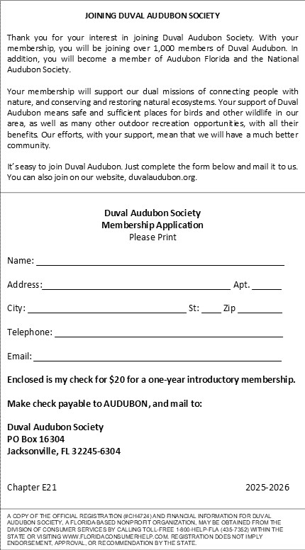 A COPY OF THE OFFICIAL REGISTRATION (#CH4724) AND FINANCIAL INFORMATION FOR DUVAL AUDUBON SOCIETY, A FLORIDA-BASED NONPROFIT ORGANIZATION, MAY BE OBTAINED FROM THE DIVISION OF CONSUMER SERVICES BY CALLING TOLL-FREE 1-800-HELP-FLA (435-7352) WITHIN THE STATE OR VISITING WWW.FLORIDACONSUMERHELP.COM. REGISTRATION DOES NOT IMPLY ENDORSEMENT, APPROVAL, OR RECOMMENDATION BY THE STATE.